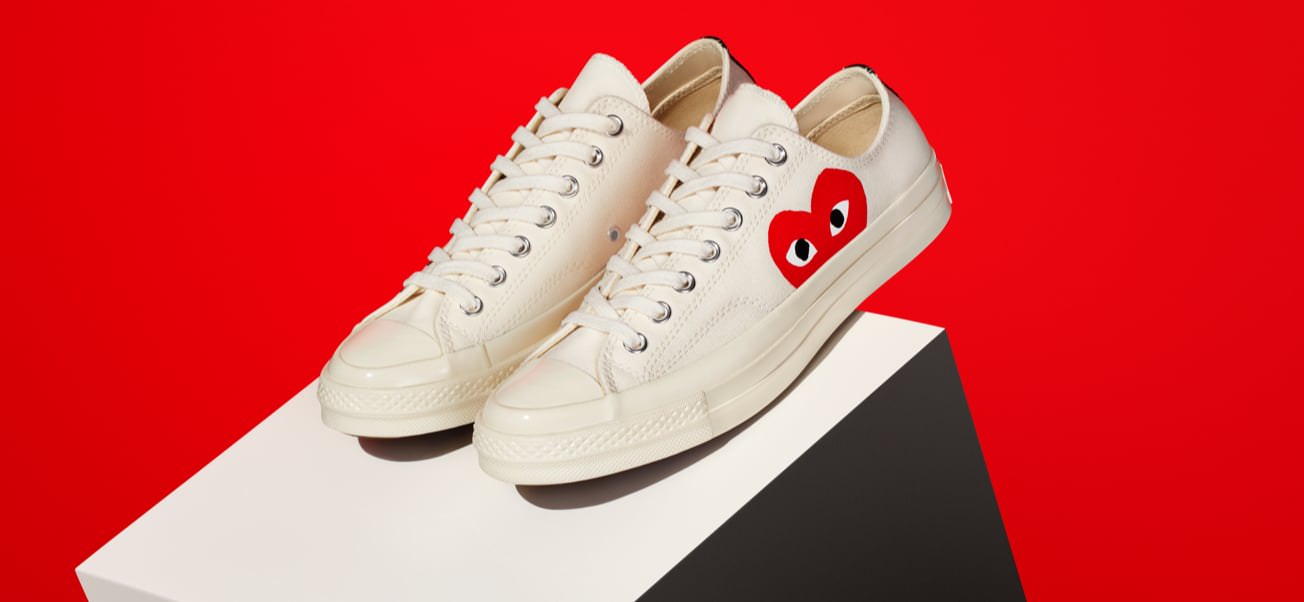 La Converse Rubber Shoe Company collabora con Comme Des Garçons ormai da 10 anni, ma è dal 2015 che le due etichette si uniscono su una Chuck Taylor 70 decorata con il famoso cuore rosso disegnato dall’artista Filip Pagowski. Sui primi modelli abbiamo visto solo parzialmente il logo del cuore, disponibili in bianco e nero, in alto e in basso, diventando il classico di questa collaborazione che si rinnova ogni anno.