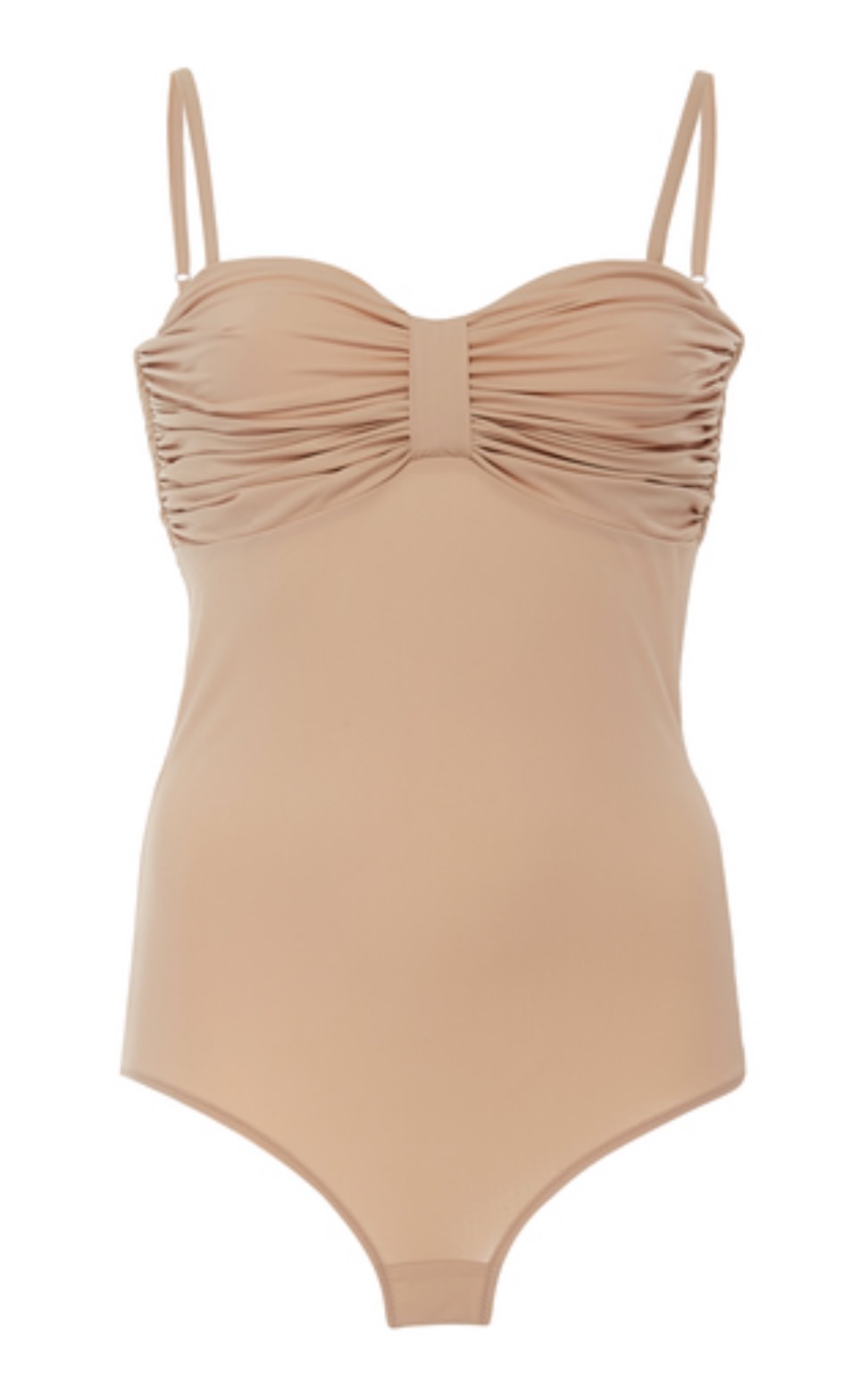 Body stretch. Effetto fiocco frontale. Sfiancato. Spalline sottili regolabili. Bottoni automatici sul fondo.