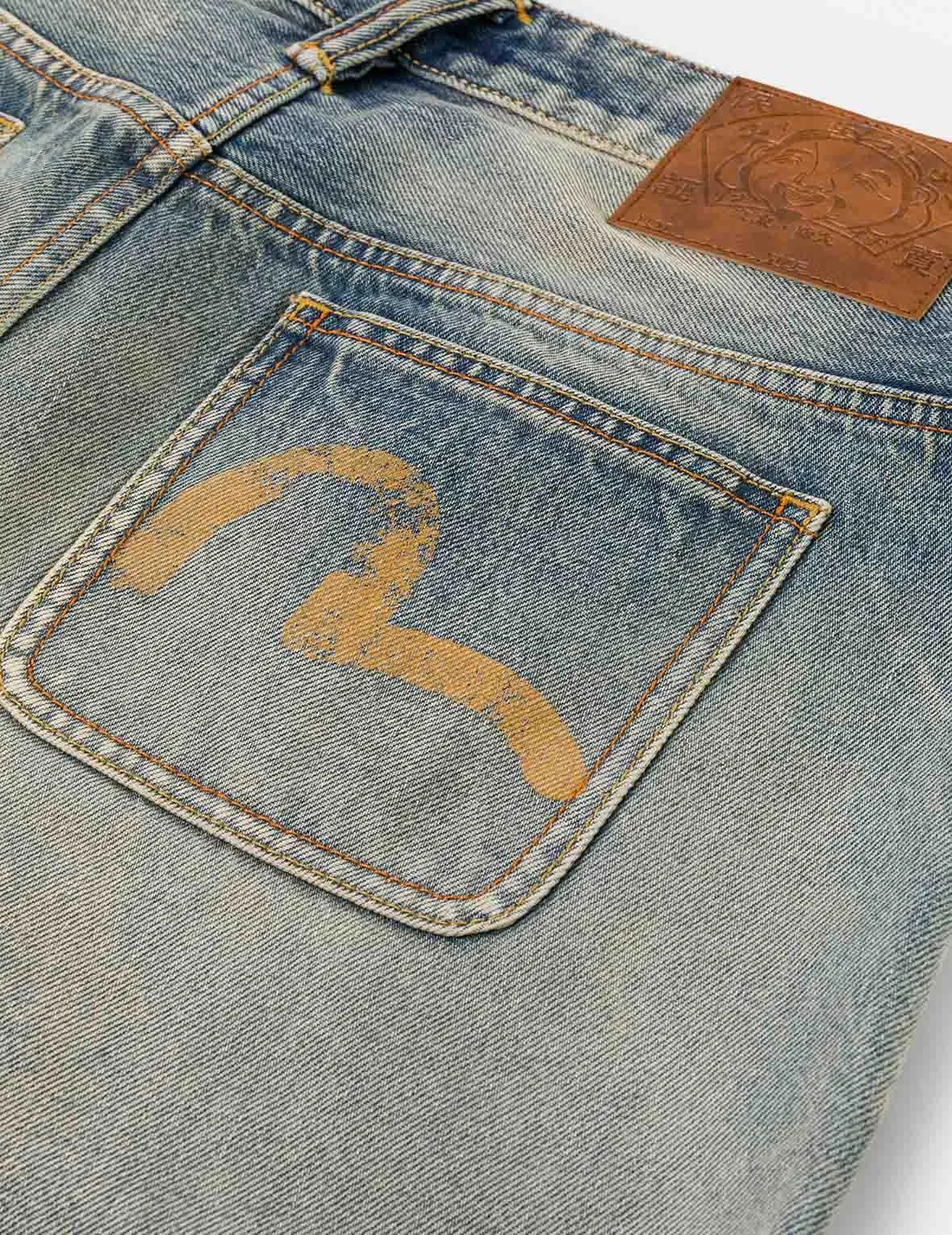 Che sia per l’uso quotidiano o per le attività casual, questi jeans aggiungeranno un tocco di stile al tuo look. Questo paio di jeans presenta dettagli slavati e il classico colore delle cuciture “EVISU”, completato da un’etichetta Western Ebisu. Il retro presenta una stampa Seagull effetto consumato, che aggiunge personalità e stile unici.